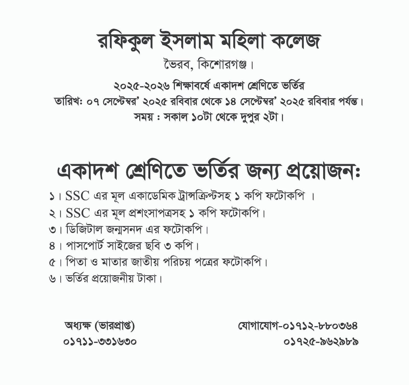 ২০২৫-২৬ সেশনে ভর্তির জন্য প্রয়োজনীয় ডকুমেন্ট ও কাগজপত্র সঙ্গে আনতে হবে।